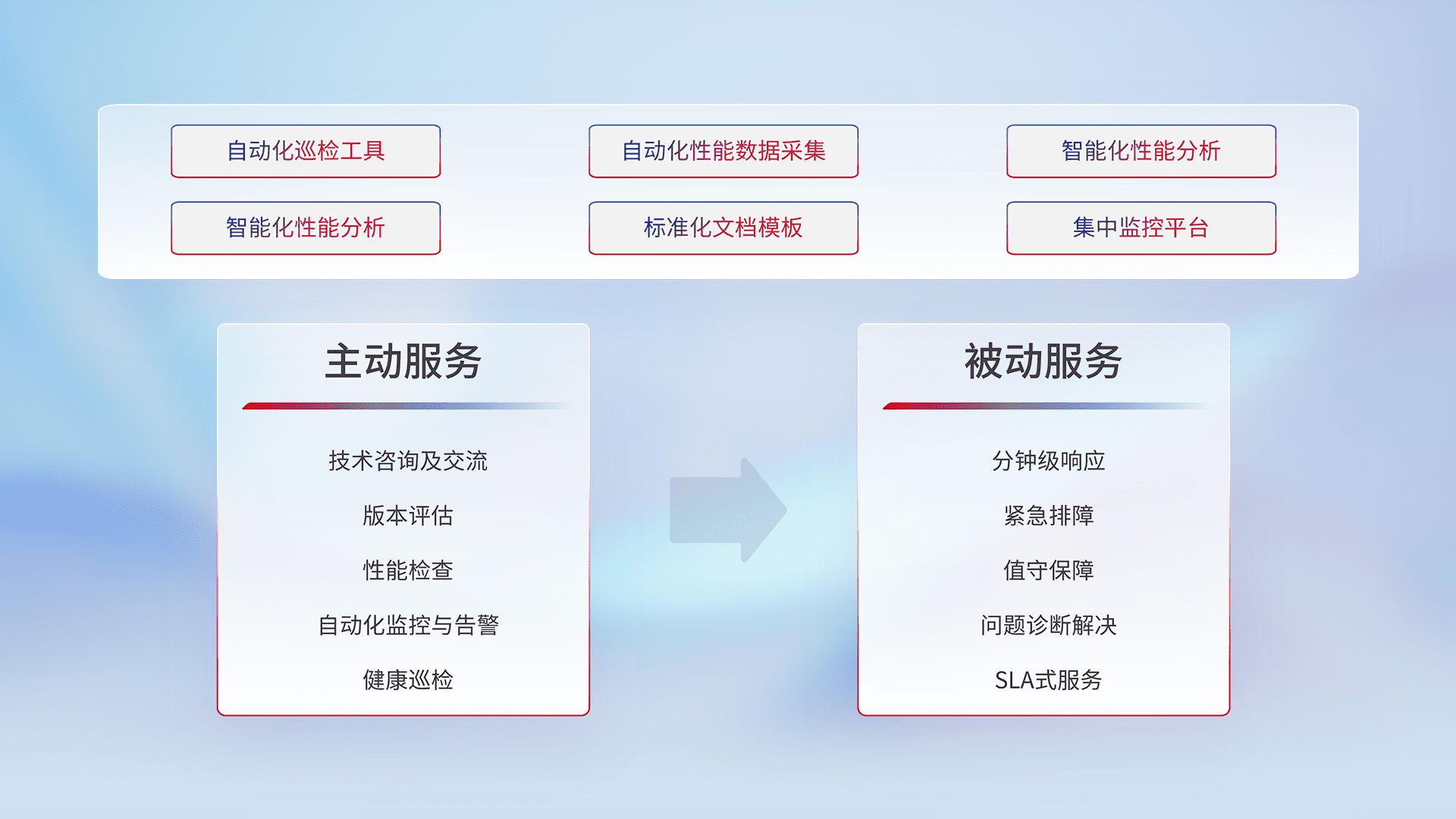 智能化工具和标准化文档,,,,保障服务质量,,,,提供主动服务(包含技术咨询、、、、版本评估、、、、性能检查、、自动化监控与告警、、、健康巡检)和被动服务包含(分钟级响应、、、紧急排障、、、值守保障、、、、问题诊断解决、、SLA服务)。。。。